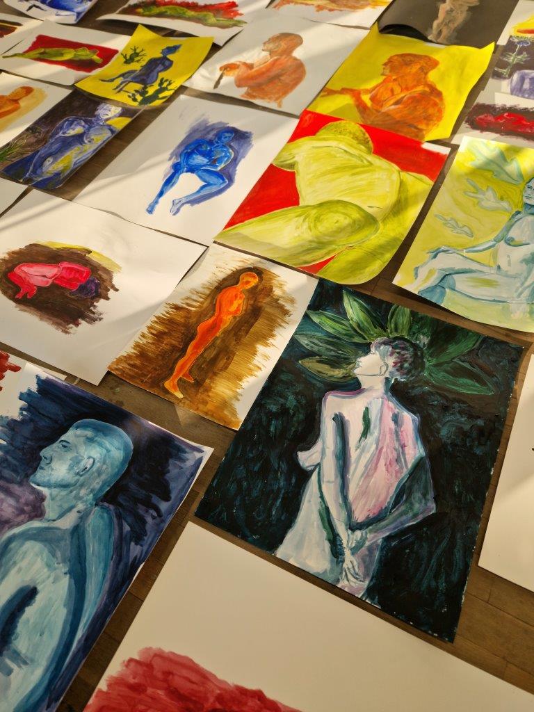 Toutes les peintures mises au sol, en tout 8 peintures réalisées + 4 grilles colorées.