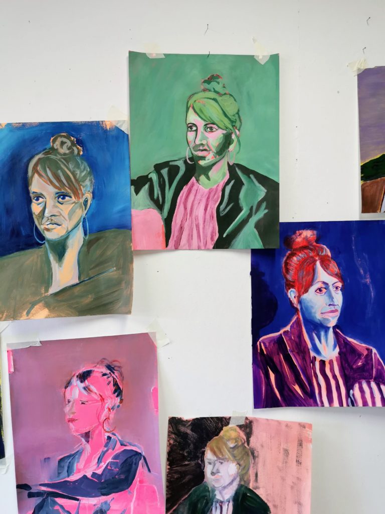 Elle sera notre fil rouge à travers ses séries de portraits hauts en couleur. Ils sont reconnaissables par le travail du fond : cette première couche de peinture qui recouvre la toile d’une couleur vive dite « néon », et qui est ensuite partiellement recouverte et obscurcis par les autres teintes du tableau. Ces touches de couleurs viennent irradier, par une lumière lancinante, les portraits de l’intérieur.